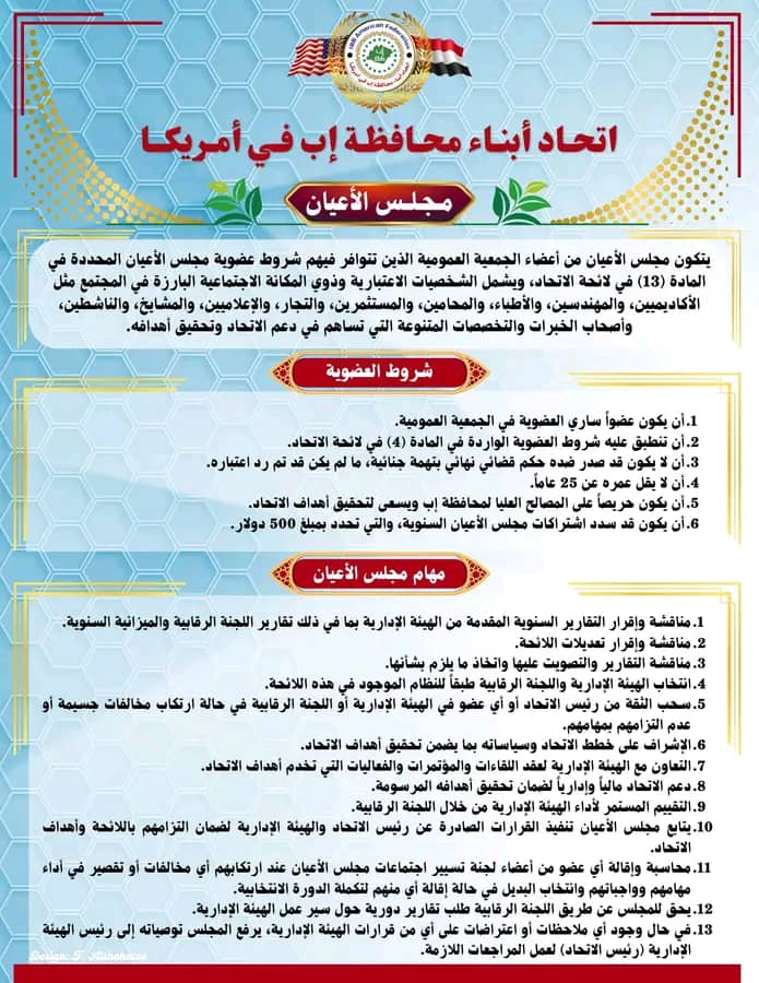 أجراس اليمن / متابعة القرار رقم (...) لسنة 2025م بشأن تشكيل مجلس الأعيان للاتحاد بسم الله الرحمن الرحيم الإخوة والأخوات أبناء محافظة إب في الولايات المتحدة الأمريكية، تحية طيبة وبعد، انطلاقًا من مبادئ العمل المؤسسي والحرص على بناء كيان اجتماعي منظم يجمع أبناء محافظة إب المقيمين في الولايات المتحدة الأمريكية تحت مظلة واحدة، واستنادًا إلى النظام الداخلي لاتحاد أبناء محافظة إب في أمريكا، واستشعارًا للمسؤولية الوطنية والاجتماعية تجاه أبناء الجالية اليمنية عامةً وأبناء محافظة إب خاصةً، وبناءً على الصلاحيات المخوّلة لرئيس الاتحاد المؤقت، يُقــــرر ما يلي: المادة (1): تشكيل مجلس الأعيان يُشكّل مجلس الأعيان لاتحاد أبناء محافظة إب في الولايات المتحدة الأمريكية لتسيير أعمال الاتحاد والإشراف على نشاطاته العامة، وذلك على النحو التالي: 1. الأستاذ/ علي مسعد الزوقري 2. الأستاذ/ نبيل فاضل 3. المهندس/ عبدالقادر هدوان 4. الأستاذ/ عارف محرم – مقرر المجلس 5. الأستاذ/ جمال الحالمي – السكرتير العام المادة (2): العمل بالقرار يُعمل بهذا القرار من تاريخ صدوره، اعتبارًا من يوم الجمعة الموافق 17 أكتوبر 2025م، المادة(٣)ويظل ساري المفعول حتى إشعارٍ آخر أو صدور قرارٍ بديل من رئاسة الاتحاد. صدر في: الولايات المتحدة الأمريكية بتاريخ: أكتوبر 2025م رئيس الاتحاد المؤقت الأستاذ/ عز الدين حمران (توقيع وختم الاتحاد) --- بيان صحفي يأتي هذا القرار في إطار الخطوات التنظيمية الأولى لانطلاقة اتحاد أبناء محافظة إب في الولايات المتحدة الأمريكية، بعد استكمال الإجراءات القانونية لتسجيل الاتحاد بصفته كيانًا اجتماعيًا خدميًا يهدف إلى توحيد جهود أبناء محافظة إب في المهجر، وتعزيز التواصل والتعاون فيما بينهم، بما يسهم في خدمة مجتمعهم داخل الولايات المتحدة وخارجها. ويمثل تشكيل مجلس الأعيان اللبنة الأولى في بناء الهيكل التنظيمي للاتحاد، تمهيدًا لتشكيل اللجنة الانتخابية التي ستتولى الإعداد والإشراف على العملية الانتخابية لاختيار الهيئة الإدارية والرقابية للاتحاد، والمزمع الإعلان عن نتائجها قبل نهاية العام الجاري. ويأتي تأسيس هذا الاتحاد انطلاقًا من الإيمان بأهمية العمل الجماعي والمشاركة المجتمعية الفاعلة، لمدّ جسور التواصل بين أبناء محافظة إب في الولايات المتحدة الذين يزيد عددهم عن الآلاف منذ عدة أجيال، والذين أسهموا بفاعلية في مختلف مجالات العمل والخدمات العامة، وكان لهم حضور مشرّف في المجتمع الأمريكي، إذ أصبحوا من الكوادر الاقتصادية والمهنية الفاعلة ومن دافعي الضرائب في هذا البلد. ويهدف الاتحاد إلى تعزيز الروابط الاجتماعية والثقافية بين أبناء الجالية، وإحياء صلة الأجيال الجديدة بجذورهم وهويتهم اليمنية، وبمسقط الرأس – محافظة إب – بما يعزز الانتماء والمسؤولية المشتركة تجاه الوطن الأم. والله وليّ التوفيق رئيس الاتحاد المؤقت الأستاذ/ عز الدين حمران
