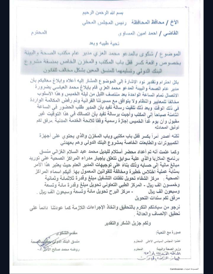 كسر أقفال منتصف الليل واتهامات باختلاس أموال دولية " تهز مكتب الصحة بتعز الحوبان" ..(( تفاصيل اكثر))