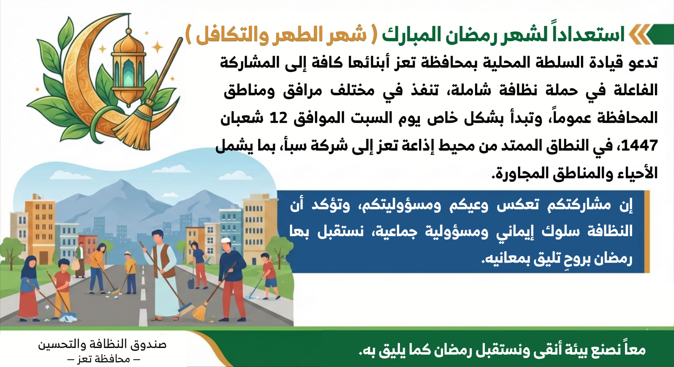 تعز تطلق حملة نظافة شاملة استعدادًا لاستقبال شهر رمضان المبارك .وتدعوا الجميع للمشاركة..