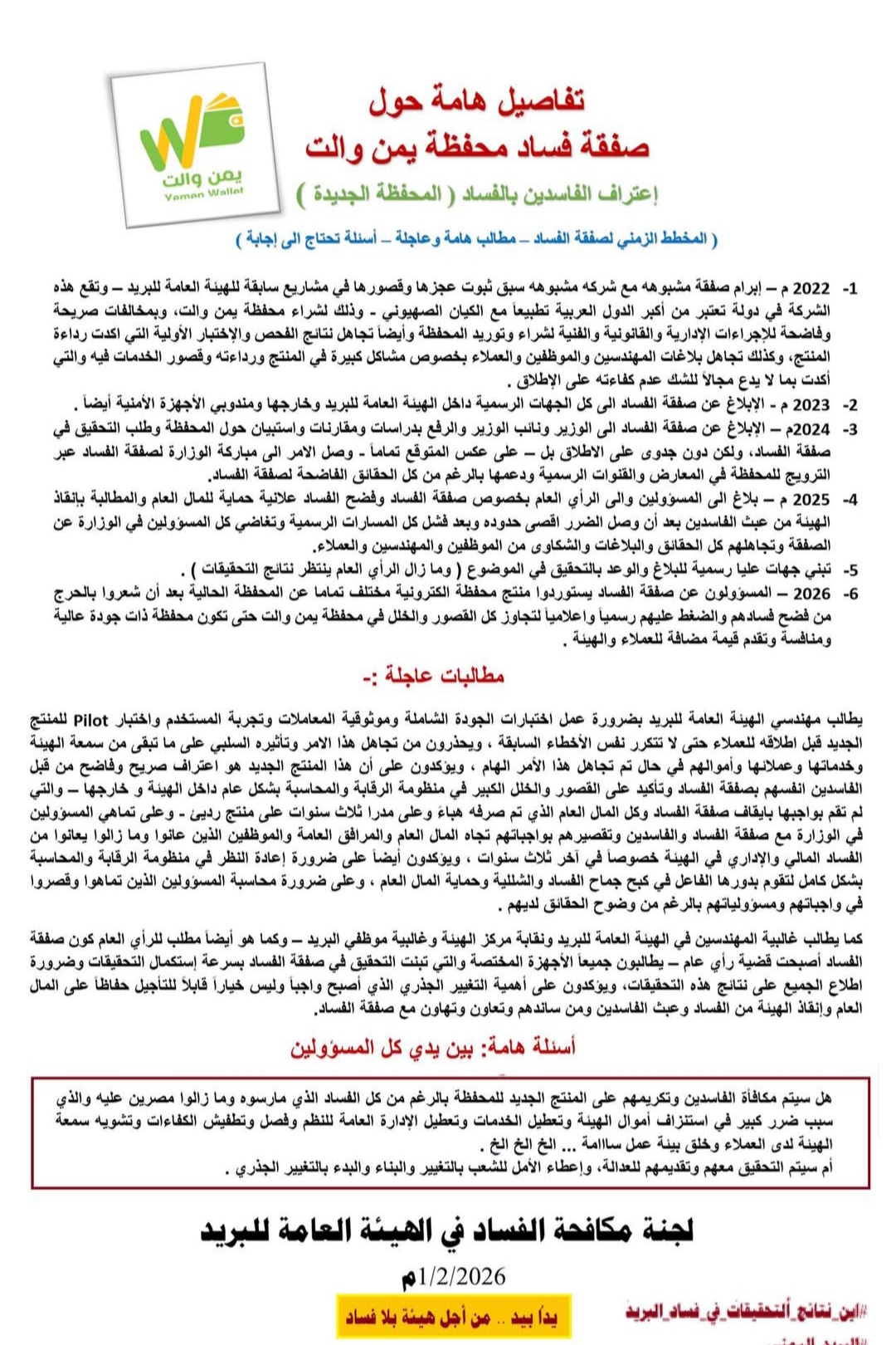 صفقة «يمن والت» بقيمة ملياري ريال تحت المجهر… استبدال المحفظة يعيد فتح ملف فساد في الهيئة العامة للبريد بصنعاء الاربعاء ـ 11 فبراير ـ 2026م صنعاء – أجراس- اليمن (خاص) كشفت مصادر فنية داخل الهيئة العامة للبريد في صنعاء عن استيراد منتج جديد لمحفظة إلكترونية بديلة لمحفظة «يمن والت»، بعد ثلاث سنوات من الجدل والبلاغات الرسمية التي تحدثت عن اختلالات فنية جسيمة وشبهات فساد رافقت الصفقة منذ إبرامها في العام 2022م. وبحسب المعلومات، أُبرمت صفقة «يمن والت» مع شركة خارجية سبق أن سجلت إخفاقات في مشاريع سابقة للهيئة، وتم تنفيذها – وفق مصادر مطلعة – بمخالفات للإجراءات الإدارية والقانونية والفنية المعتمدة، وسط تجاهل لنتائج فحوصات واختبارات أولية أكدت ضعف كفاءة المنتج وعدم جاهزيته التشغيلية. مليارا ريال مقابل أربع أيقونات وأضافت المصادر أن قيمة صفقة محفظة «يمن والت» بلغت – بحسب ما تم تداوله داخل الأوساط الفنية والرقابية – نحو ملياري ريال يمني، موزعة على أربع أيقونات تشغيلية فقط، وبقيمة تقارب نصف مليار ريال لكل أيقونة، في صفقة وصفتها المصادر بأنها تثير تساؤلات واسعة حول آلية التسعير، ومعايير التعاقد، ومدى التناسب بين الكلفة المرتفعة ومستوى المنتج الفني والخدمات المقدمة. وأكدت أن هذه الكلفة جاءت في وقت تعاني فيه الهيئة من ضغوط مالية، في مقابل أعطال متكررة للمحفظة وتعطل عدد من الخدمات المرتبطة بها، ما فاقم شكاوى الموظفين والعملاء. بلاغات متراكمة وتجاهل رسمي وأوضحت المصادر أن مهندسين وموظفين في الهيئة قاموا خلال عامي 2023 و2024 برفع بلاغات متكررة إلى قيادة الهيئة ووزارة الاتصالات وتقنية المعلومات، مرفقة بتقارير فنية ودراسات مقارنة واستبيانات مستخدمين، طالبت بوقف العمل بالمحفظة والتحقيق في ملابسات الصفقة، إلا أن تلك البلاغات لم تلقَ – بحسب المصادر – استجابة فعلية. وعلى العكس، جرى الترويج لمحفظة «يمن والت» في معارض وفعاليات رسمية، والاستمرار في دعمها رغم تصاعد شكاوى العملاء واستمرار القصور الفني. ومع مطلع العام 2025، خرجت القضية إلى العلن بعد فشل القنوات الرسمية، حيث تم إبلاغ الرأي العام بتفاصيل الصفقة باعتبارها تمس المال العام وسمعة الهيئة وخدماتها، ما دفع جهات رسمية عليا إلى تبني الملف والتعهد بفتح تحقيق شامل، دون إعلان نتائج التحقيقات حتى اليوم. وفي تطور لافت، أفادت المصادر بأن الجهات ذاتها قامت خلال العام 2026 باستيراد محفظة إلكترونية جديدة تختلف كليًا عن «يمن والت»، في خطوة اعتبرها مهندسون داخل الهيئة إقرارًا ضمنيًا بفشل الصفقة السابقة بعد ثلاث سنوات من الهدر المالي والتشغيل غير المستقر. ودعا مهندسو الهيئة إلى إخضاع المنتج الجديد لاختبارات جودة شاملة تشمل الأمان وموثوقية المعاملات وتجربة المستخدم، وتنفيذ تشغيل تجريبي قبل إطلاقه رسميًا، محذرين من أن تجاهل ذلك قد يؤدي إلى تكرار الأخطاء السابقة وتعميق فقدان ثقة العملاء. وشدد مهندسون وموظفون، مدعومون بنقابتهم، على ضرورة إعادة النظر في منظومة الرقابة والمحاسبة داخل الهيئة وخارجها، ومحاسبة كل من ثبت تورطه أو تقصيره في صفقة «يمن والت»، مؤكدين أن التغيير الجذري بات ضرورة لحماية المال العام وإنقاذ الهيئة من مزيد من التدهور. وفي ظل غياب نتائج التحقيقات، تبقى التساؤلات قائمة حول ما إذا كانت الجهات المختصة ستتجه نحو المساءلة القانونية الشاملة، أم الاكتفاء بتجاوز الملف رغم ما خلّفه من أضرار مالية وإدارية وخدمية جسيمة.
