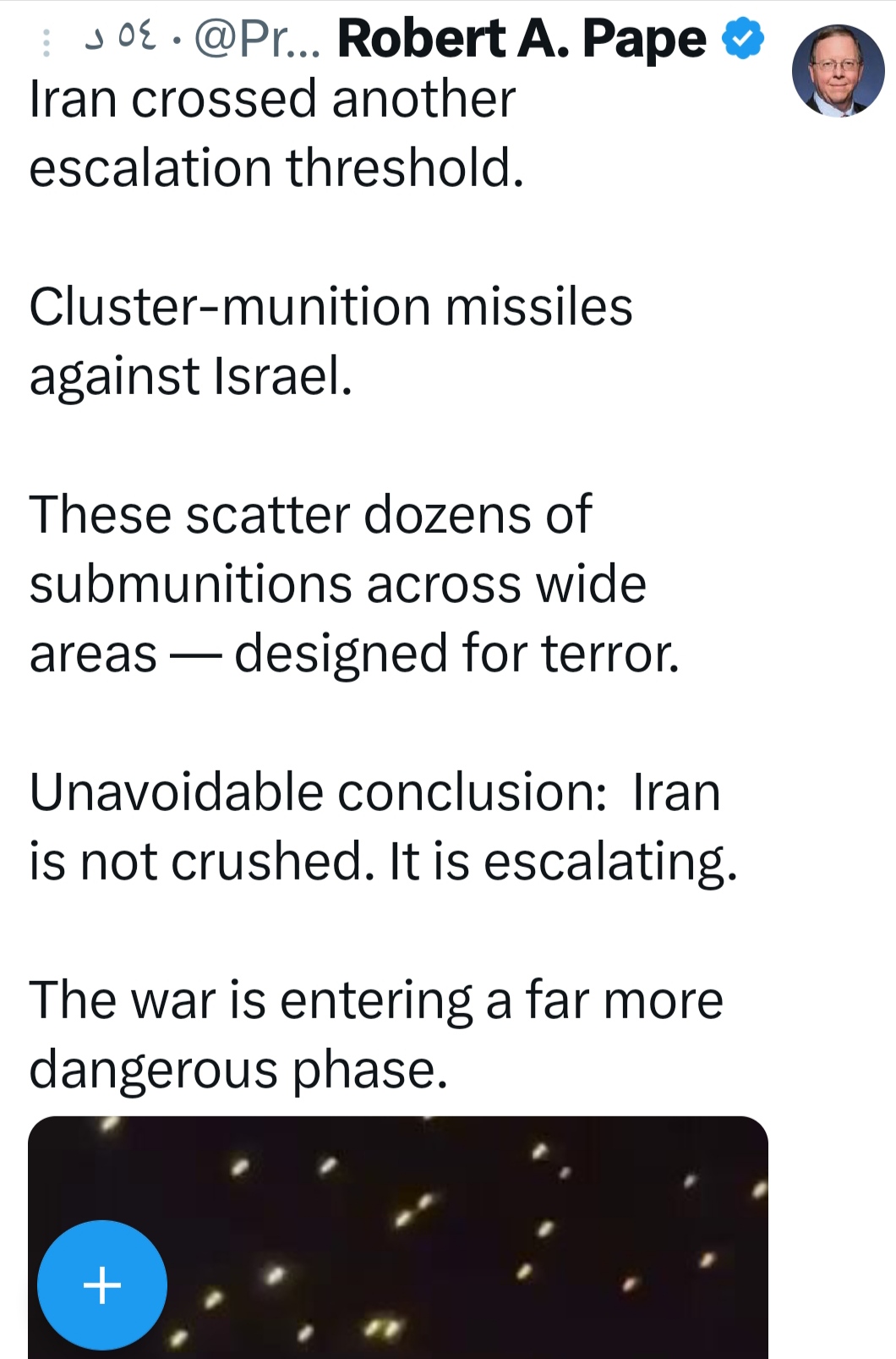 عاجل:إيران تصعد الحرب ضد إسرائيل بصواريخ عنقودية متابعات دولية أجراس-اليمن أعلن أستاذ العلوم السياسية بجامعة شيكاغو، البروفسور بوب باب، المتخصص في الشؤون الأمنية والمدير المؤسس لمشروع شيكاغو للأمن والتهديدات (CPOST)عبر منصة التداول إكس" أن إيران أطلقت صواريخ عنقودية على أراضٍ إسرائيلية، محققة تصعيداً جديداً في النزاع المستمر بالمنطقة. وأوضح البروفسور باب أن هذه الصواريخ تنشر عشرات الذخائر الصغيرة عبر مساحات واسعة، ما يجعلها أسلحة تهدف إلى خلق الرعب بين المدنيين والمقاتلين على حد سواء. وأشار إلى أن هذا الهجوم يؤكد أن إيران لم تُحبط بعد، بل إنها تتعمد تصعيد النزاع، ما يهدد بدخول الحرب مرحلة أكثر خطورة على الصعيد الإقليمي والدولي.