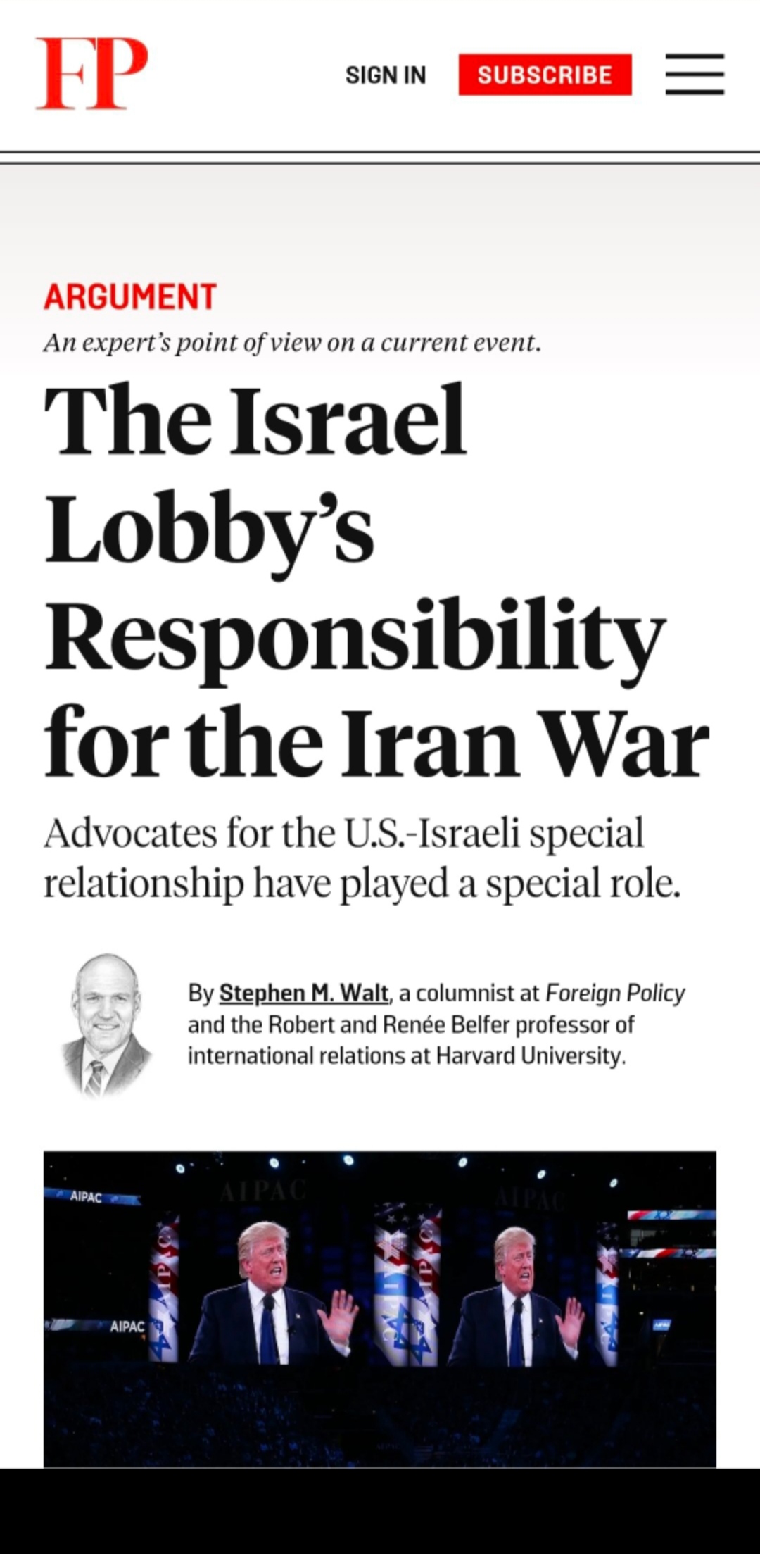 اللوبي الإسرائيلي.. قوة سياسية داخل واشنطن ..ودوره في الحرب الإيرانية..لـ: صحيفة فورين بوليسي الخميس ـ 19 مارس ،2026م متابعات دولية| أجراس- اليمن الكاتب: ستيفن إم. والت – أستاذ العلاقات الدولية في جامعة هارفارد وكاتب عمود في مجلة فورين بوليسي. نشرت مجلة فورين بوليسي مقالًا تحليليًا للكاتب ستيفن إم. والت، أستاذ العلاقات الدولية في جامعة هارفارد، سلط فيه الضوء على الدور الذي يلعبه اللوبي الإسرائيلي في الولايات المتحدة، لا سيما اللجنة الأمريكية للشؤون العامة الإسرائيلية (AIPAC)، في توجيه السياسات الأمريكية نحو إيران ودفعها نحو صراع مسلح محتمل. المحور الرئيسي للمقال الكاتب يناقش فكرة أن جماعات الضغط الداعمة للعلاقة الخاصة بين الولايات المتحدة وإسرائيل (اللوبي الإسرائيلي)، بما في ذلك منظمات مثل اللجنة الأمريكية للشؤون العامة الإسرائيلية (AIPAC)، كانت لها دور مهم في دفع إدارة الرئيس الأمريكي نحو خيار الحرب ضد إيران. النقاط الأساسية المترجمة للمقال العلاقة بين واشنطن وتل أبيب طويلة الأمد الكاتب يشير إلى أن العلاقات الأمريكية‑الإسرائيلية ليست فقط علاقات تحالف تقليدية، بل لها أبعاد سياسية داخلية في الولايات المتحدة تؤثر على صنع القرار في موضوعات مثل ايران دور جماعات الضغط (اللوبي) يرى أن جماعات الضغط المؤيدة لإسرائيل تمارس تأثيرًا كبيرًا على المجتمع السياسي الأمريكي من خلال العلاقات مع أعضاء الكونغرس، وسائل الإعلام، والدوائر السياسية، ممّا يسهم في خلق مناخ يؤيد سياسات أكثر عدائية تجاه إيران. لماذا هذا مهم في سياق الحرب الإيرانية في الوقت الذي يرى فيه الكاتب أن القرار النهائي بالعمل العسكري يعود في نهاية المطاف إلى الرئيس الأمريكي وحلفائه، فهو يُبرز أن اللوبي الإسرائيلي لعب — وفقًا لتحليله — دورًا في تكوين القرارات وسياسات الاستراتيجية العامة التي أدّت في النهاية إلى الحرب مع إيران. ليس السبب الوحيد، لكن عامل مهم المقال لا يذهب أبعد من ذلك ليقول إن اللوبي هو السبب الوحيد للحرب، وإنما أنه عامل مؤثر ضمن مجموعة من العوامل التي دفعت واشنطن نحو هذا الخيار. تلميحات نقدية لإدارة السياسة الخارجية المقال يحث القرّاء على التفكير في مدى تأثير اللوبيات السياسية على السياسات الخارجية، وكيف يمكن للضغوط الداخلية أن تتداخل مع المصالح الاستراتيجية الوطنية الأمريكية. المقال يقدم تحليلًا نقديًا لمدى تأثير اللوبي الإسرائيلي في الولايات المتحدة على قرار الحرب مع إيران، ويطرح أن دور هذه الجماعات — من خلال التأثير على صناع القرار الأمريكي — كان من العوامل التي ساهمت في رسم مسار الأحداث التي أوصلت إلى هذا الصراع. لكنه في الوقت نفسه لا يُحمّل اللوبي وحده المسؤولية الكاملة، بل يضعه ضمن مجموعة من القوى والمؤثرات في السياسة الخارجية الأمريكية.