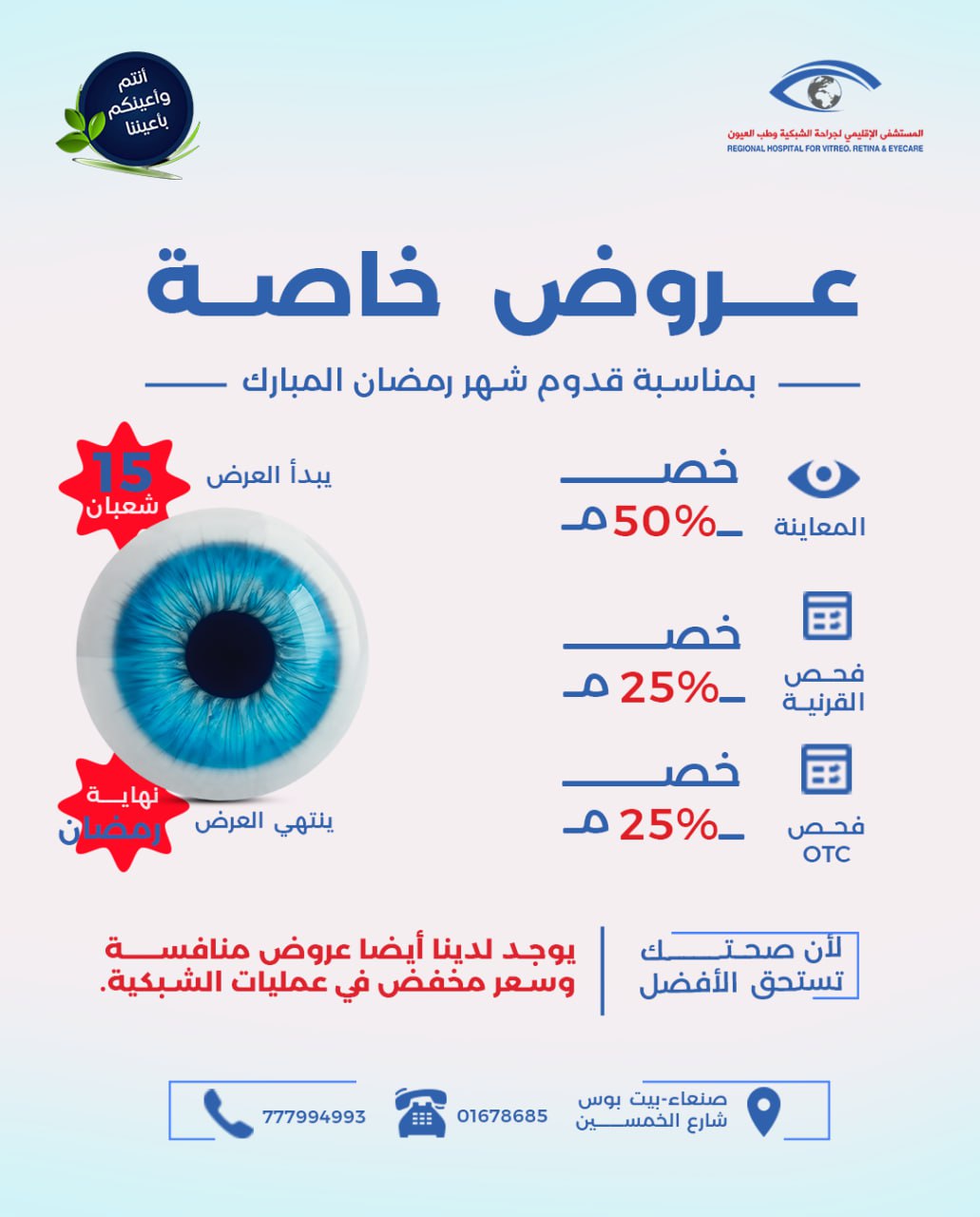 المستشفى الإقليمي لجراحة الشبكية وطب العيون يطلق عروضًا مفاجئة وخصومات كبيرة خلال شعبان ورمضان