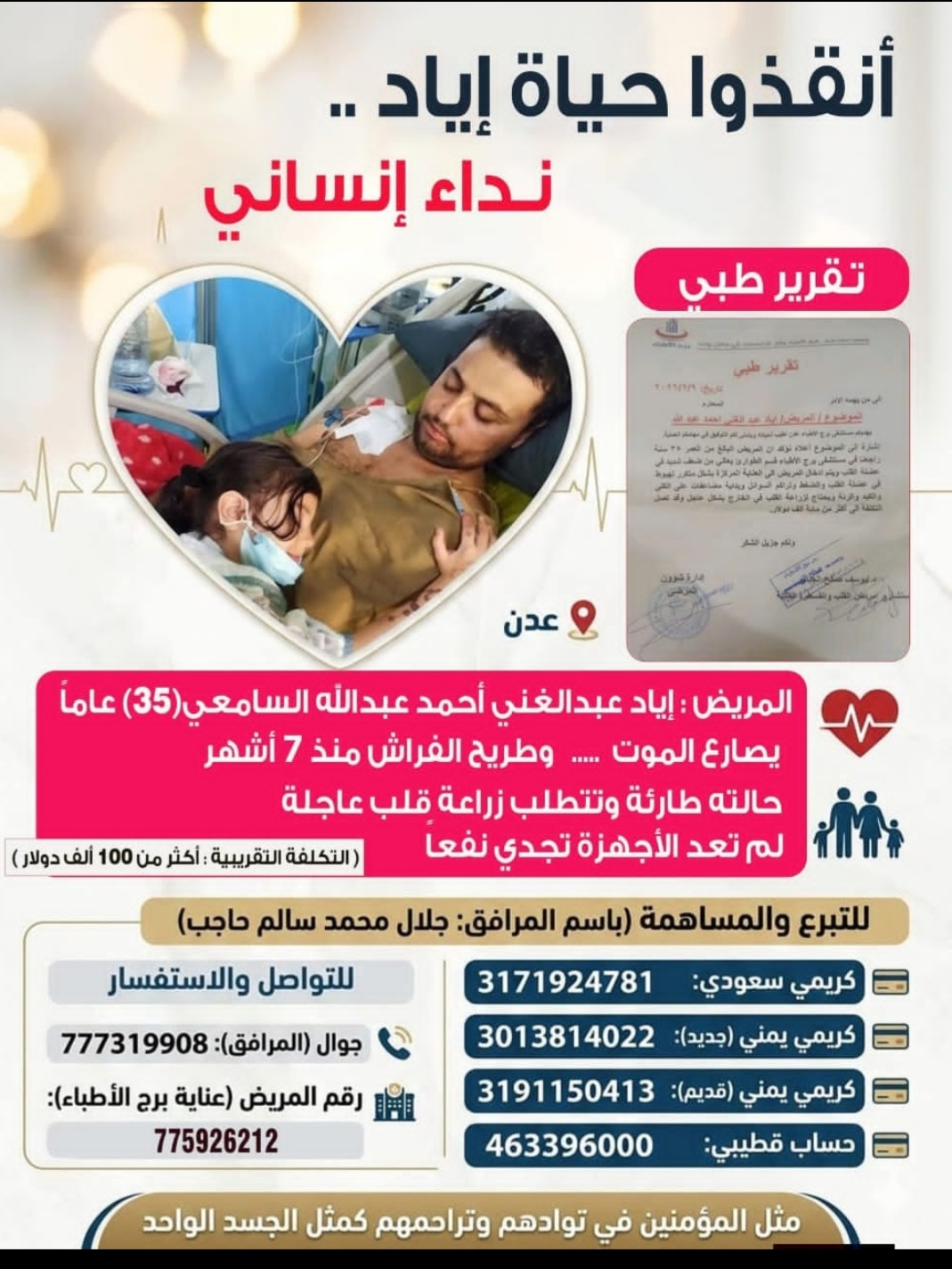 نداء إنساني لإنقاذ حياة شاب يمني يحتاج إلى زراعة قلب عاجلة